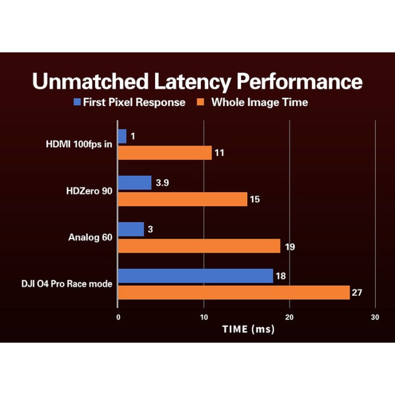 - By integrating the entire goggle display pipeline with HDZero’s fixed-latency video transmission, these goggles achieve 3ms glass-to-glass sub-frame latency with no jitter or dropped frames