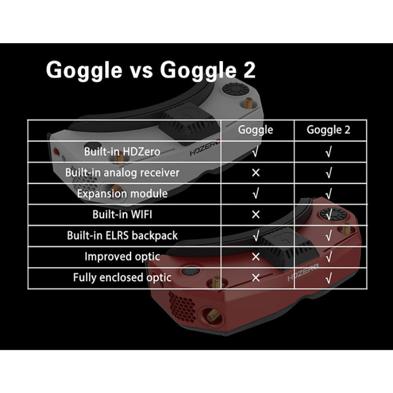 HDZero Goggle 2 builds on the success of the original with practical upgrades pilots will appreciate: a sharper, dust-resistant optic module, built-in analog receiver, integrated WiFi for wireless mirroring, and a protective hard case. It keeps everything that made the original great—ultra-low latency, open-source flexibility, and all-in-one digital + analog support—while adding more value and convenience for everyday flying.